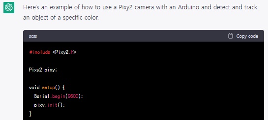 인공지능 chatGPT 에게 Pixy 센서를 사용하기 위한 Arduino 용 샘플 코드를 요청했더니 아래와 같은 코딩 결과를 출력했습니다.