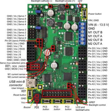 Orangutan SVP fully assembled PCB with pins labeled. |