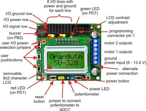 오랑우탄 SV-328 로봇 컨트롤러는 소형 로봇을 위한 완벽한 제어 솔루션입니다. 6~ 13.5 V. 소형 (2.15 "x 1.9") 모듈에는 강력한 Atmel ATmega328P AVR 마이크로 컨트롤러, 각각 (연속), 1 A 모터 포트, 탈착식 8 자 x 2 라인 액정 디스플레이, 버저, 3 사용자 푸시 버튼 스위치 및 두 개의 사용자 LED가 있습니다.