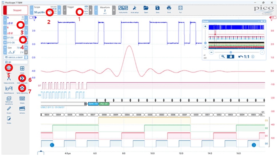 - 오실로스코프 컨트롤 : PicoScope의 전체 아날로그 도메인 컨트롤 (줌, 필터링 및 신호 생성기 포함)은 모두 MSO 디지털 신호 모드에서 사용할 수 있습니다.